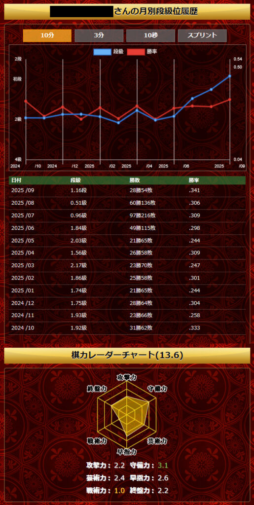 『将棋ウォーズ』10分の級位を、現在の棋力・級位として記録しています。